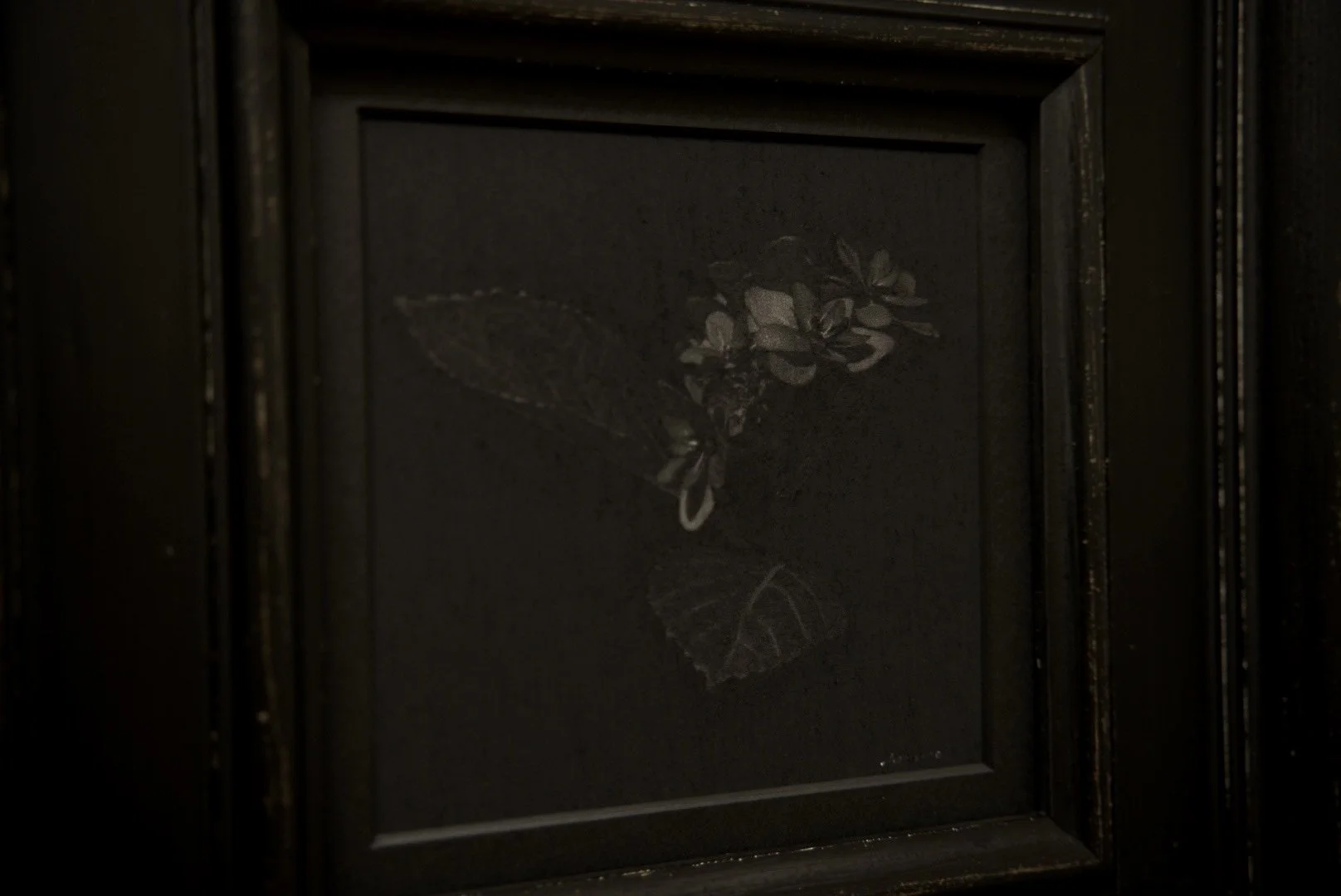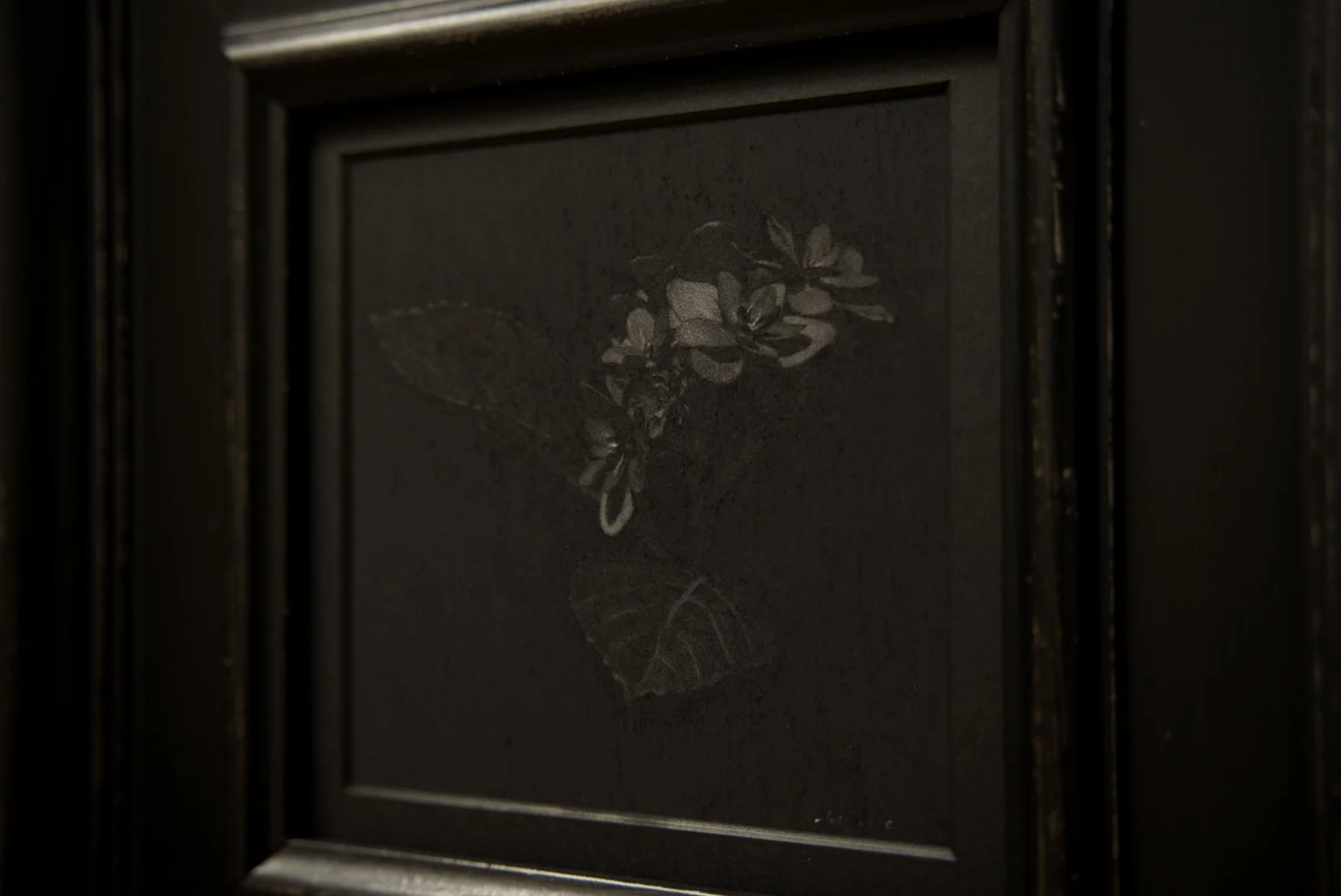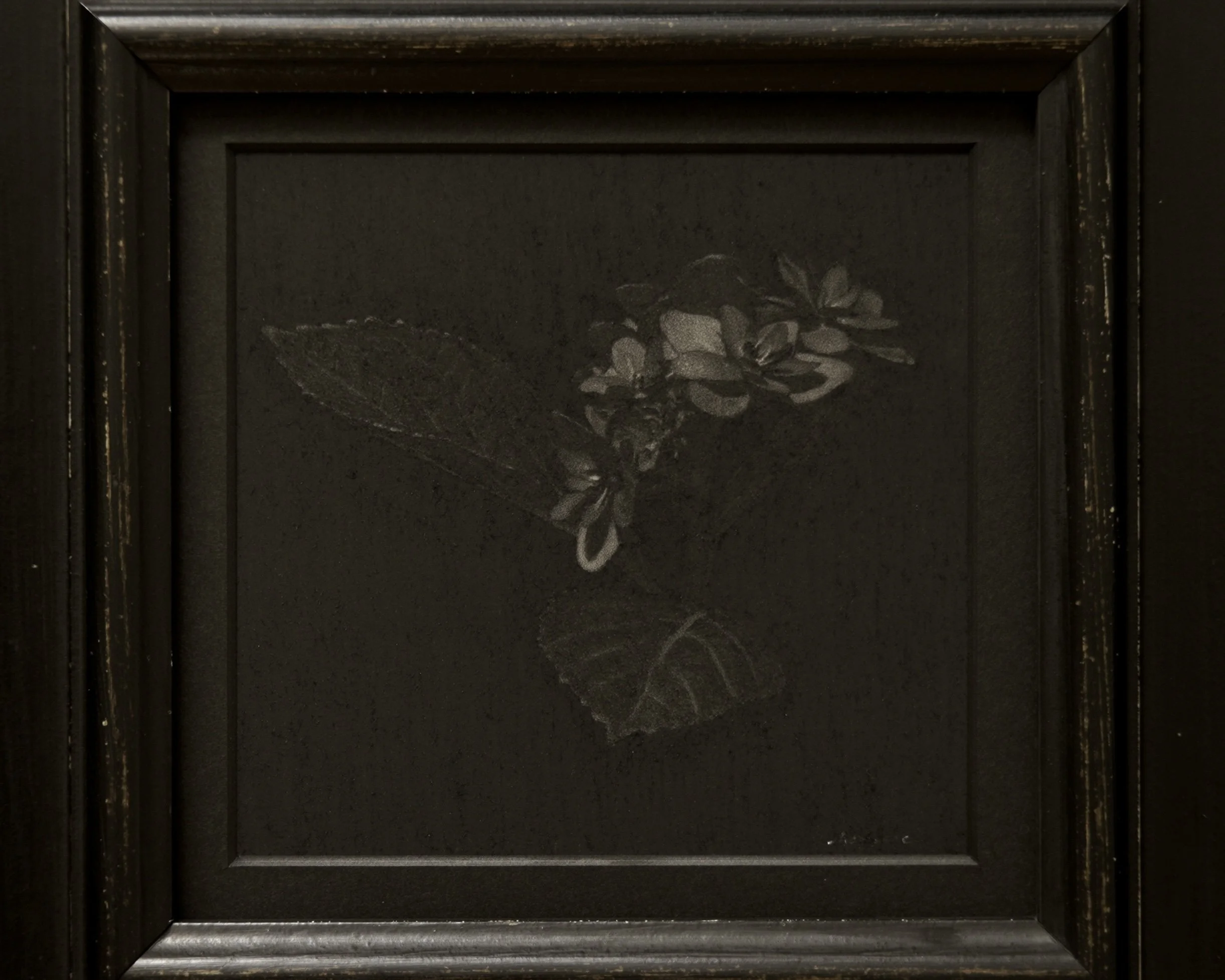 Charcoal on paper. 128 x 123 mm紫陽花の花の鉛筆画。気軽に飾ることのできるミニシリーズ作品のひとつです。木炭鉛筆で描かれる瑞々しい花びらの表現が魅力的です。紙は最高級のパルプ紙を使用。ミニシリーズ専用額縁は廃盤のため、新規ご注文分は画像と異なる仕様でのお届けとなります。Sold Out / New Order制作期間:20日Price: ¥156,000