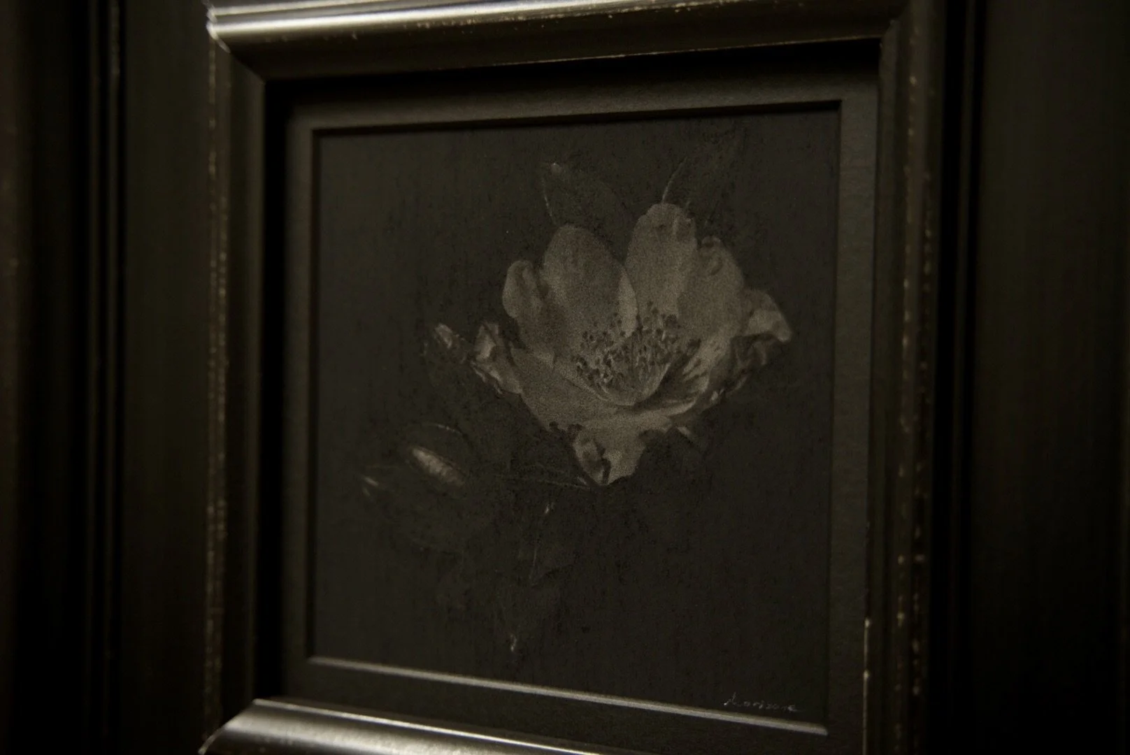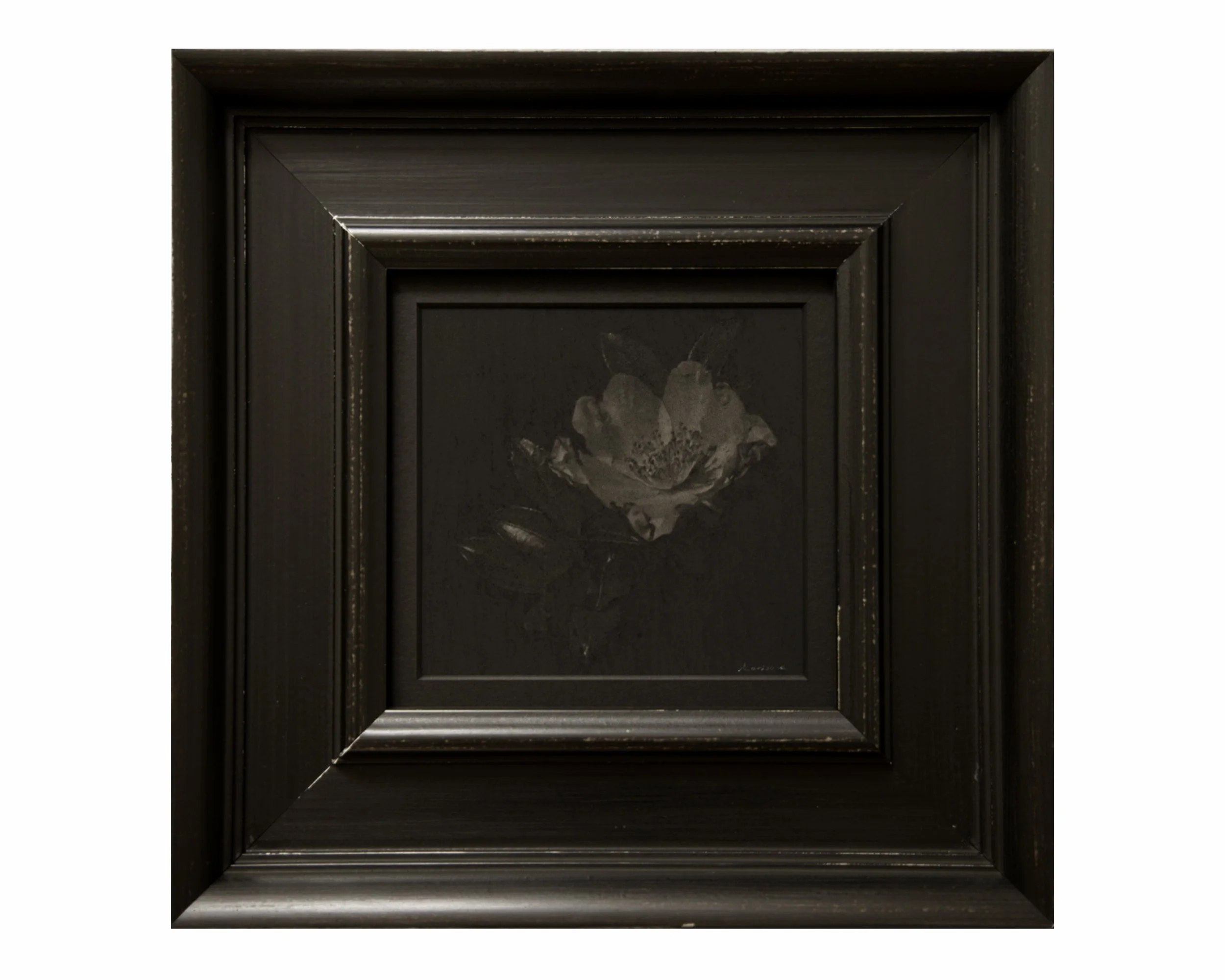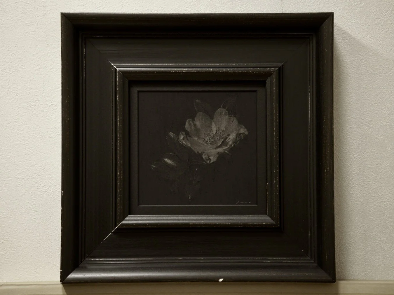 Charcoal on paper. 128 x 123 mmサザンカの花の鉛筆画。気軽に飾ることのできるミニシリーズ作品のひとつです。木炭鉛筆で描かれる艶葉の表現が魅力的です。紙は最高級のパルプ紙を使用。専用額縁は廃盤のため、新規ご注文分は画像と異なる仕様でのお届けとなります。Sold Out / New Order制作期間:20日Price: ¥142,000